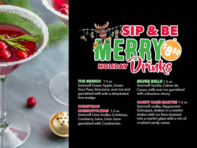 Drop in after a long day of shopping and try one of our Sip and Be Merry Drink Specials.